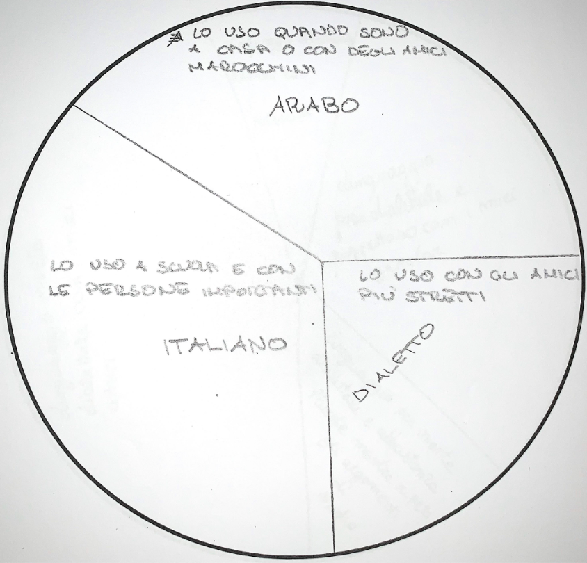 Gli studenti devono trasformare il cerchio in un grafico a torta che rappresenta tutti i diversi modi in cui comunicano in una giornata solita. (Oppure in qualsiasi altro arco di tempo. Ad esempio, una bambina che passa ogni estate in Sri Lanka potrebbe voler trattare il cerchio come un anno interno. Così, la sua torta includerà anche i tre mesi in cui parla molto più spesso in Tamil o Singalese con i parenti.)