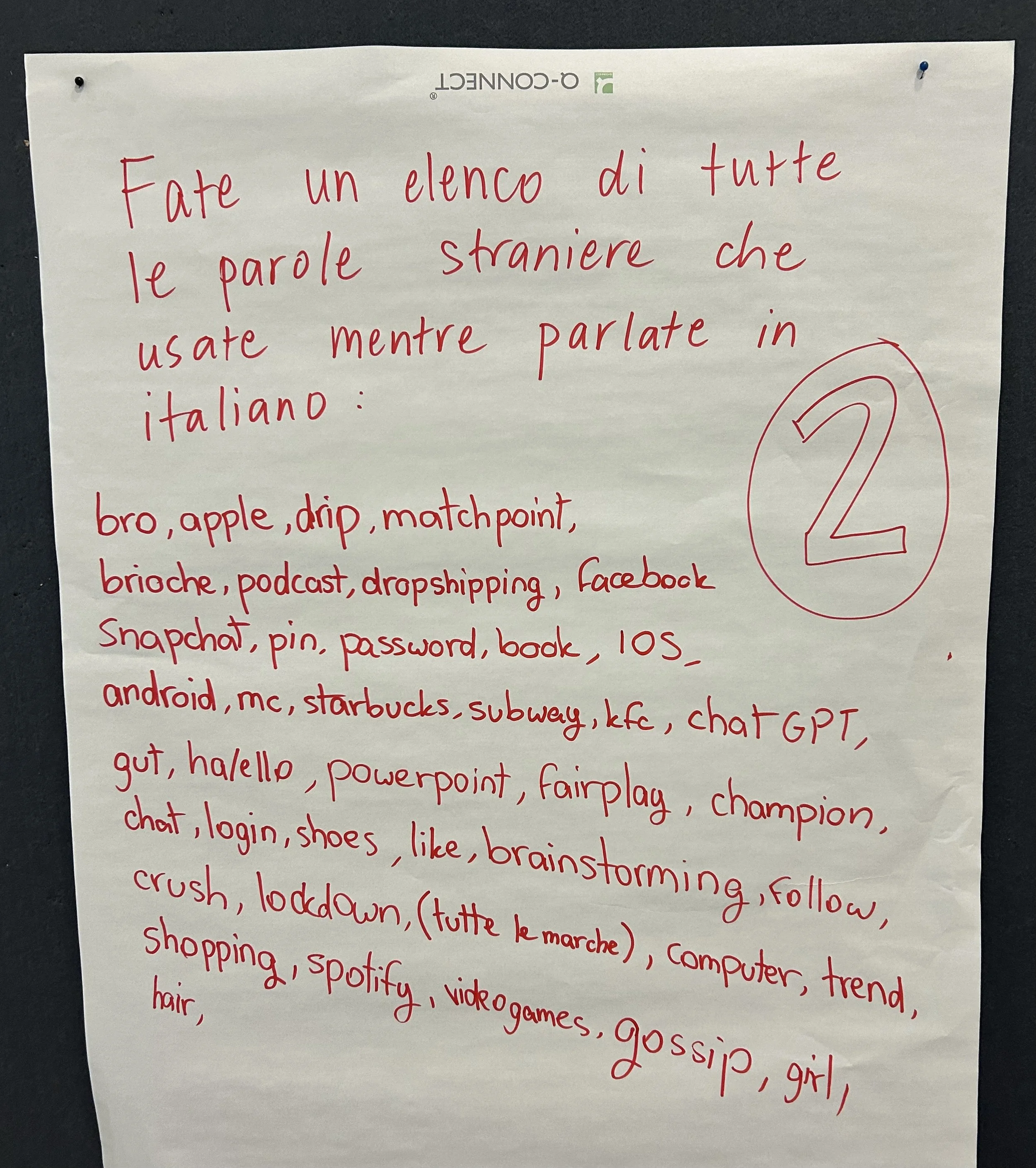 Fate un elenco di tutte le parole straniere che usate mentre parlate in italiano(task riflessivo —> orientato a scoprire come le lingue si intrecciano)