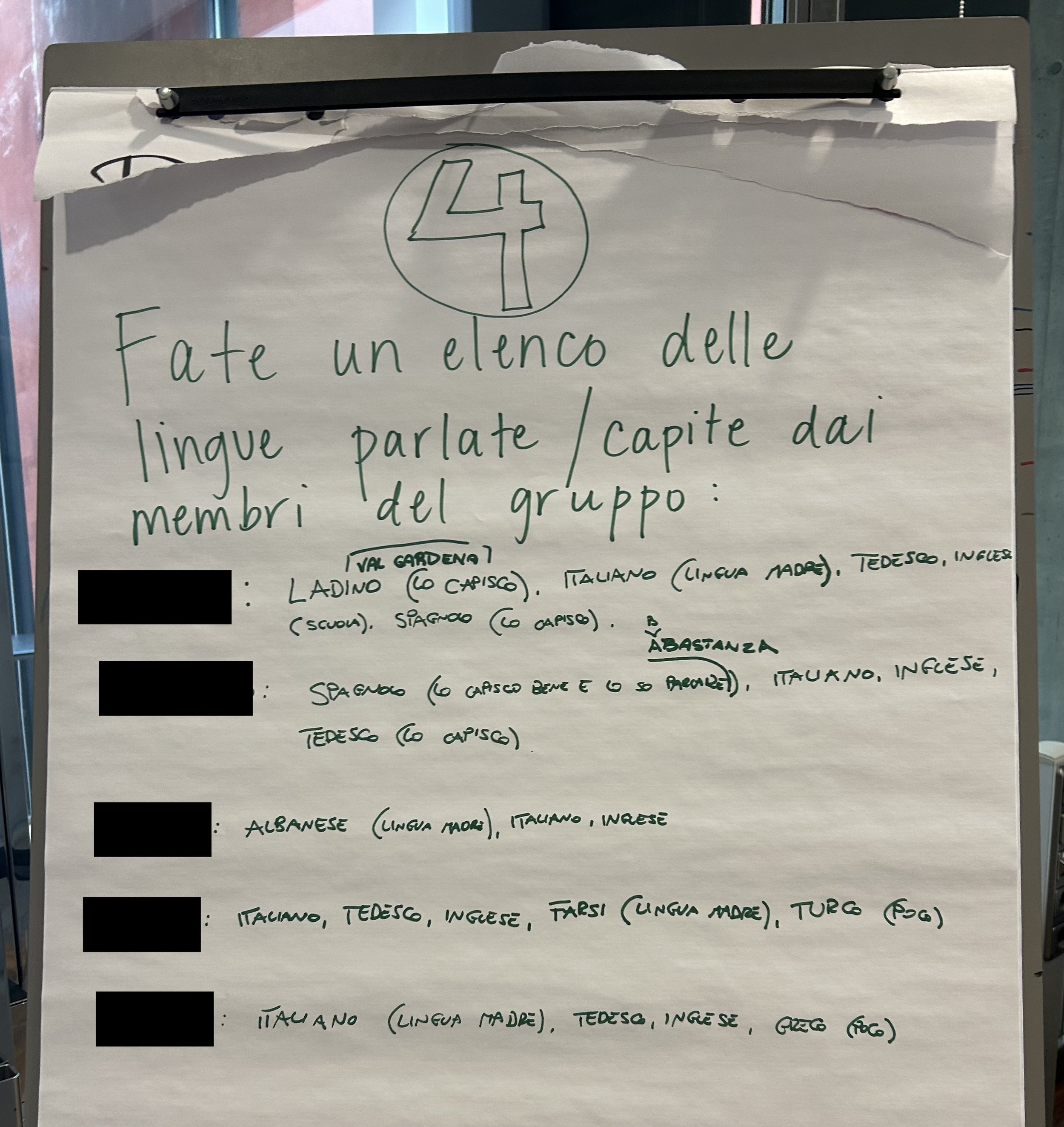 Fate un elenco delle lingue parlate / capite dai membri del gruppo(task collettivo —> orientato a scoprire le risorse linguistiche non solo dell’individuo ma del gruppo)